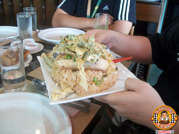 Something that they ordered that ended up being my favorite thing on the menu that I had tried was the Sinangag na Sinigang (try saying that ten times really fast). I'm not much of a Sinigang eater, because I'm not very fond of sour food. But this was just too good to pass up. Whoever conceptualized this is a genius. Everyone who eats sinigang mixes the soup into their rice. This dish does it for you. (For you lazy bums out there) And it throws in a juicy strip of liempo in just for good measure!Are you worried that you'd be eating a soggy dish for lunch? Well don't be! They added vegetable tempura on top of the rice just so it won't look like they're serving you a bowl of mush! And guess what? It's absolutely delicious!!! The wetness and sour tinge of the rice, and the crunch of the veggie tempura creates a tasty balance that makes this dish awesome! (not to mention the pork is really fatty hehe) Rina swears that she'd drive up all the way to Laguna for this dish (Even though I did tell her there's a branch already in Katipunan and Alabang.)